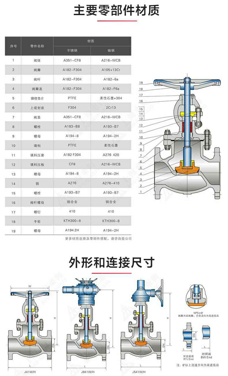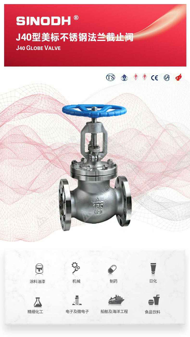 J40型美标不锈钢截止阀,为苏州俊鹏海洋资源开发有限公司自主研发生产。本产品的设计制造符合美国国家标准ANSIB16.34,美国石油学会标准AP1 6D和AP I 600要求,产品结构紧凑密、刚性好、封性性能优秀是一种最常见的启闭阀,利用闸板的上下工作来接通(全开)和截断(全关)管道中的流体介质。