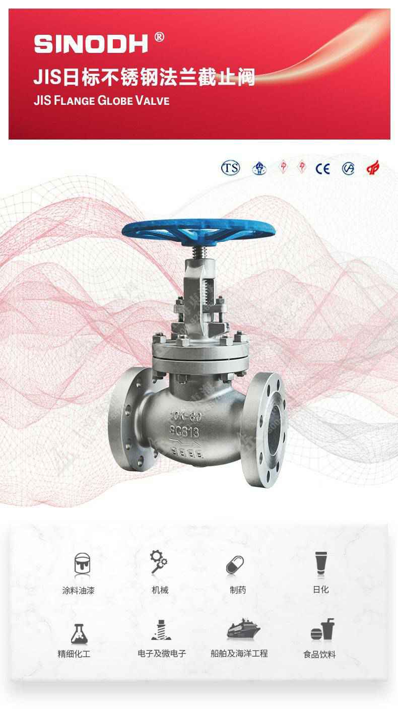 JIS日标不锈钢法兰截止阀,为苏州俊鹏海洋资源开发有限公司自主研发生产。本产品设计制造标准符合J1SB2071标准,其启闭件是圆柱形的阀瓣,密封面呈平面或锥面,阀瓣沿流体的中心线作直线运动。国标截止阀只适用于全.开和全关,一般不用来调节流量,定做时允许作调节和节流。